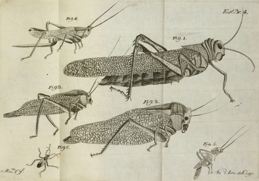 (Insetos que atacam os algodoeiros – Tipos de gafanhotos, Estampas 3 e 4). Almeida, Francisco Tomás de, 1778-1866 (grav.) Lisboa: Na Officina da Casa Litteraria do Arco do Cego, 1799