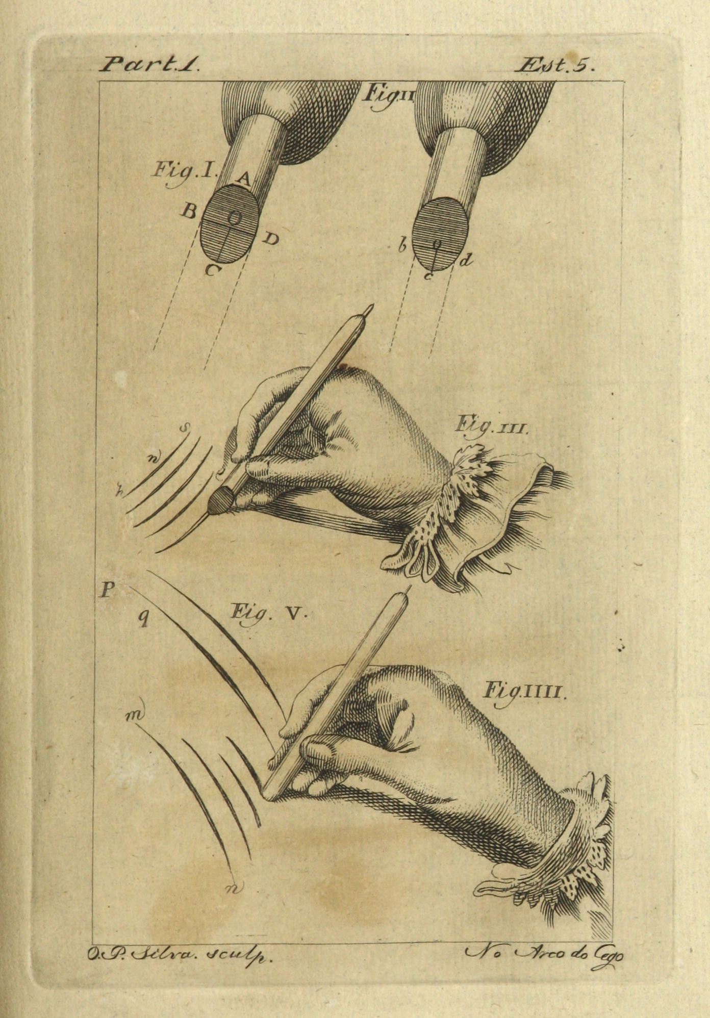 (Modo de fazer os traços grossos com as chapas, e o meio de as ver, e manejar sobre a chapa envernizada, Estampa 5). P. Silva (grav.), Lisboa : Typographia Chalcographica, Typoplastica e Litteraria do Arco do Cego, 1801. Arquivo digital da Brasiliana USP.
