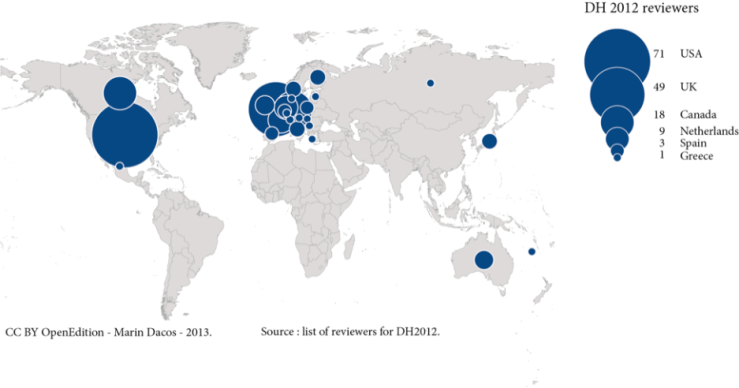 Estas particularidades do ‘giro semântico’ das Humanidades para as Humanidades Digitais (e Digitales) pode ser bem ilustrada, ainda, pelo seguinte mapa, produzido por Marin Dacos, que mostra o absoluto domínio da anglofonia nas instâncias de publicação acadêmica voltadas às Humanidades Digitais (ou melhor dito, de fato, ‘Digital Humanities’):