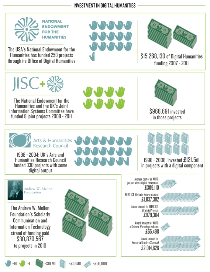 Resta a dimensão mais estritamente material do problema – a questão da distribuição de recursos financeiros para as pesquisas. Quanto a isso, vamos olhar alguns números brutos (e alguns deles, brutais) sobre a distribuição geográfica das pesquisas em ‘Humanidades Digitais’ no mundo e sobre a distribuição de recursos materiais para as pesquisas filiadas ao rótulo: