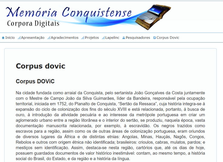 Por conta do recorte temático do nosso curso, a lista aqui reunida não contempla bem a área mais produtiva e populosa das pesquisas em Humanidades Digitais sobre a língua portuguesa: a chamada linguística de corpus. São muitos e muito bons os projetos de construção de corpora do português, no Brasil e em Portugal; nossa lista inclui apenas os projetos envolvidos com corpora do português histórico, feitos no Brasil, e que lançam mão de ferramentas computacionais de modo intensivo. Uma lista completa e curada dos corpora do português pode ser encontrada na Linguateca – https://www.linguateca.pt