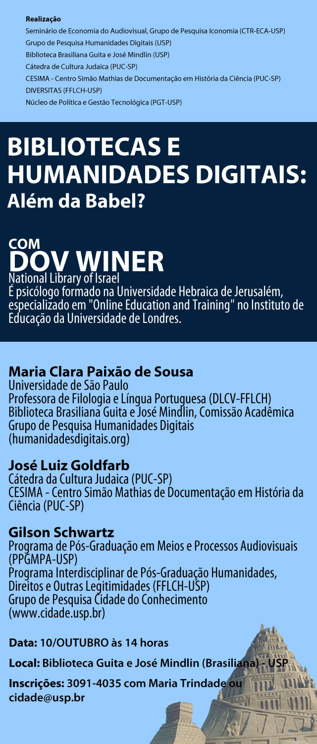 O I Seminário em Humanidades Digitais no Brasil propõe uma reflexão em torno da relação entre as humanidades e as tecnologias digitais na atualidade, lançando o debate sobre as “Humanidades Digitais” na comunidade de pesquisas brasileira.